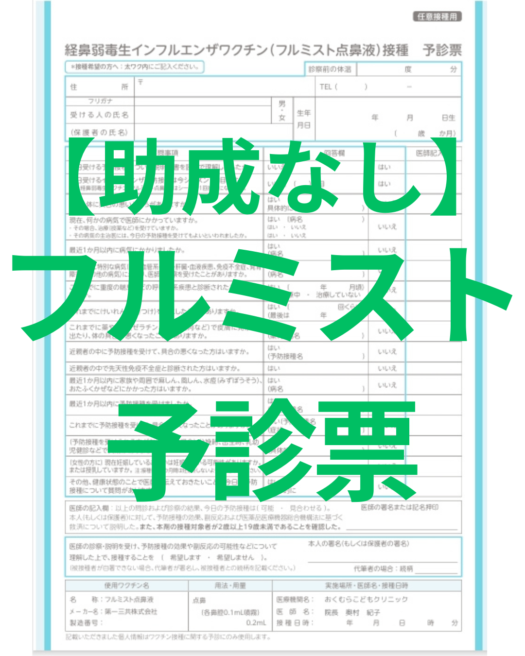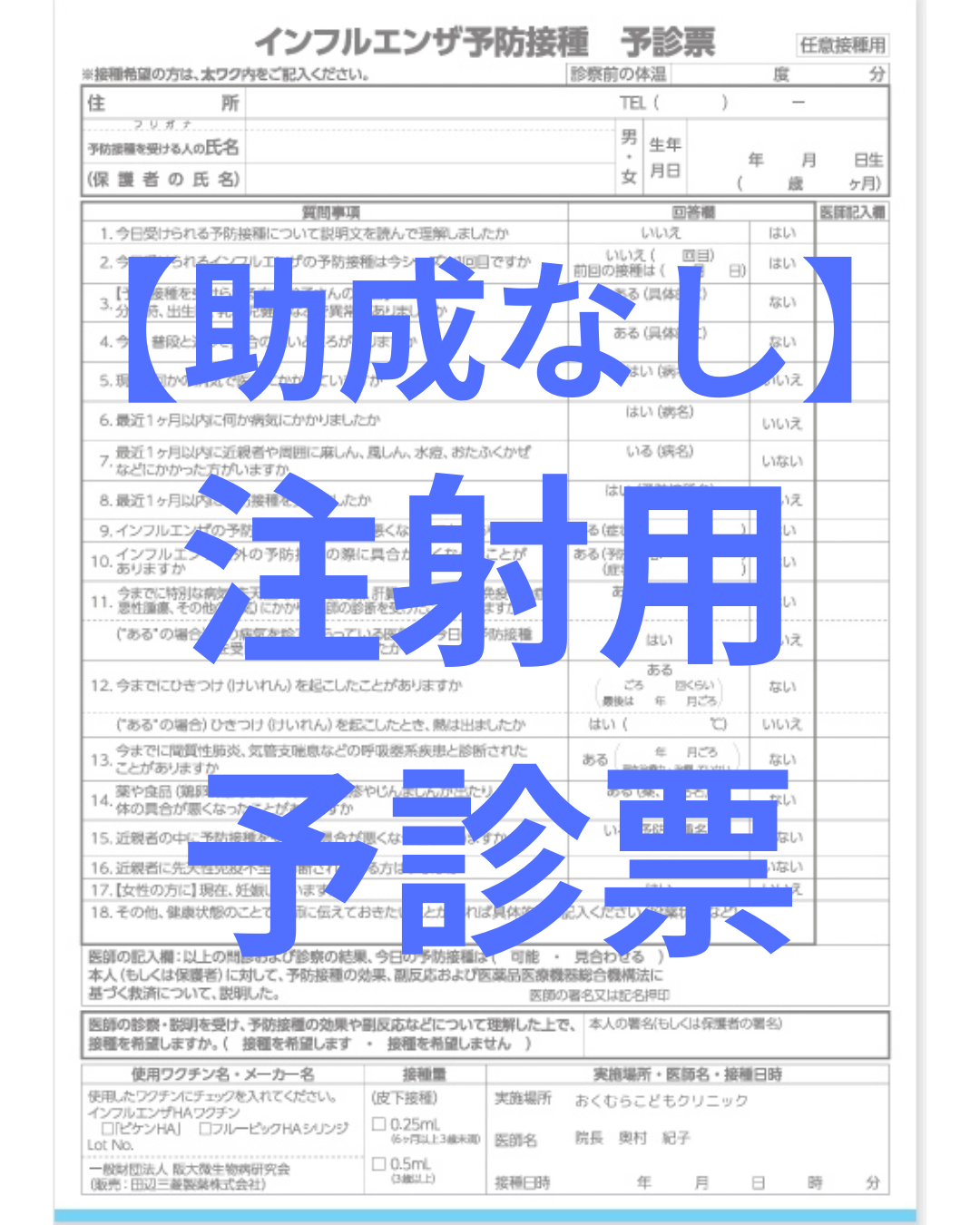 各種様式ダウンロード ページ内目次 一般診療(当院を初めて受診される方) 予防接種(任意接種) 夜尿症外来 低身長の相談 発達とこころの外来 2025年度インフルエンザワクチン予診票 各種問診票のダウンロードが可能です。 受診される前に、ご自宅でダウンロードし記入して持参していただくと、来院時の待ち時間短縮・ご案内がスムーズにおこなえます。ご協力お願い致します。 一般診療(当院を初めて受診される方) 一般診療の問診票です。 夜尿症外来、低身長の相談を受診される方もご記入していただき、各種問診票と一緒にご持参ください。 予防接種(任意接種) 任意予防接種の予診票のダウンロードができます。(定期予防接種以外のものです。) 事前にダウンロード・記入をして来ていただくと、ご案内がスムーズです。 夜尿症外来 ご予約後、 ⇒当院を初めて受診される方は、【夜尿症外来】問診票+【一般診療】問診票を記入して頂き、一緒にお持ちください。 ⇒受診されたことのある方は、【夜尿症外来】問診票のみを記入して頂き、お持ちください。 低身長の相談 ご予約後、 ⇒当院を初めて受診される方は、【低身長の相談】問診票+【一般診療】問診票を記入して頂き、一緒にお持ちください。 ⇒受診されたことのある方は、【低身長の相談】問診票のみを記入して頂き、お持ちください。 当日、現在までの身長の経過が分かるもの(母子手帳など)をお持ちください。 発達とこころの外来 ●お電話での予約後、窓口でのお渡しのみとなります。 2025年度インフルエンザワクチン予診票 岐阜市の助成を利用しない方は、下記の予診票をダウンロードしてお使いいただけます。 ※岐阜市の助成対象の方は専用の予診票があるため、こちらの予診票は使えません。